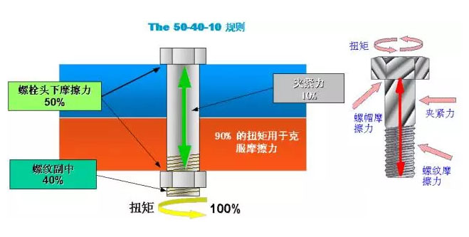 參見(jiàn)圖A:通常情況下,在螺栓的擰緊過(guò)程中,實(shí)際轉(zhuǎn)化為螺栓夾緊力的扭矩僅占10%,其余50%用于克服螺栓頭下的摩擦力,40%用于克服螺紋副中的摩擦力,這就是“541”規(guī)則,主要反映夾緊力與摩擦力之間的關(guān)系。但若施加一定的改善措施(如涂抹潤(rùn)滑油)或螺紋副中存有缺陷(如雜質(zhì)、磕碰等),該比例關(guān)系會(huì)受到不同影響而改變。