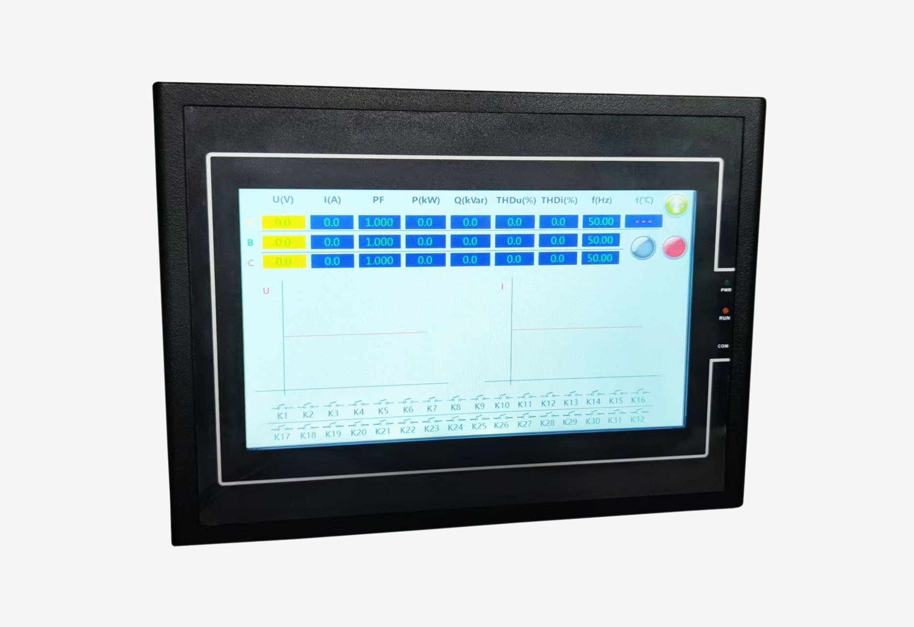 觸摸屏無功補(bǔ)償控制器以高速數(shù)字信號處理器為核心,采用交流取樣,人機(jī)界面為7寸點(diǎn)陣大屏幕液晶觸摸顯示器,其具有配電監(jiān)測、無功補(bǔ)償、諧波分析。具備多種保護(hù)功能,報(bào)警輸出功能;可檢測柜內(nèi)溫度,并啟動散熱風(fēng)機(jī)(定制);并可監(jiān)測開關(guān)狀態(tài)。